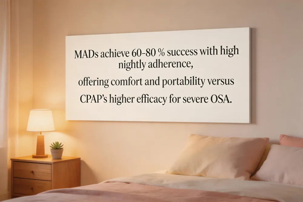 Custom‑fitted mandibular advancement devices (MADs) achieve successful treatment in roughly 60 %–80 % of patients with mild‑to‑moderate obstructive sleep apnea (OSA), typically defined as a ≥50 % drop in the apnea‑hypopnea index (AHI) and an AHI < 10 events/hour. Their higher adherence—often 70 %–80 % of nights—helps offset the slightly lower efficacy compared with CPAP, which remains the gold‑standard for moderate‑to‑severe OSA.