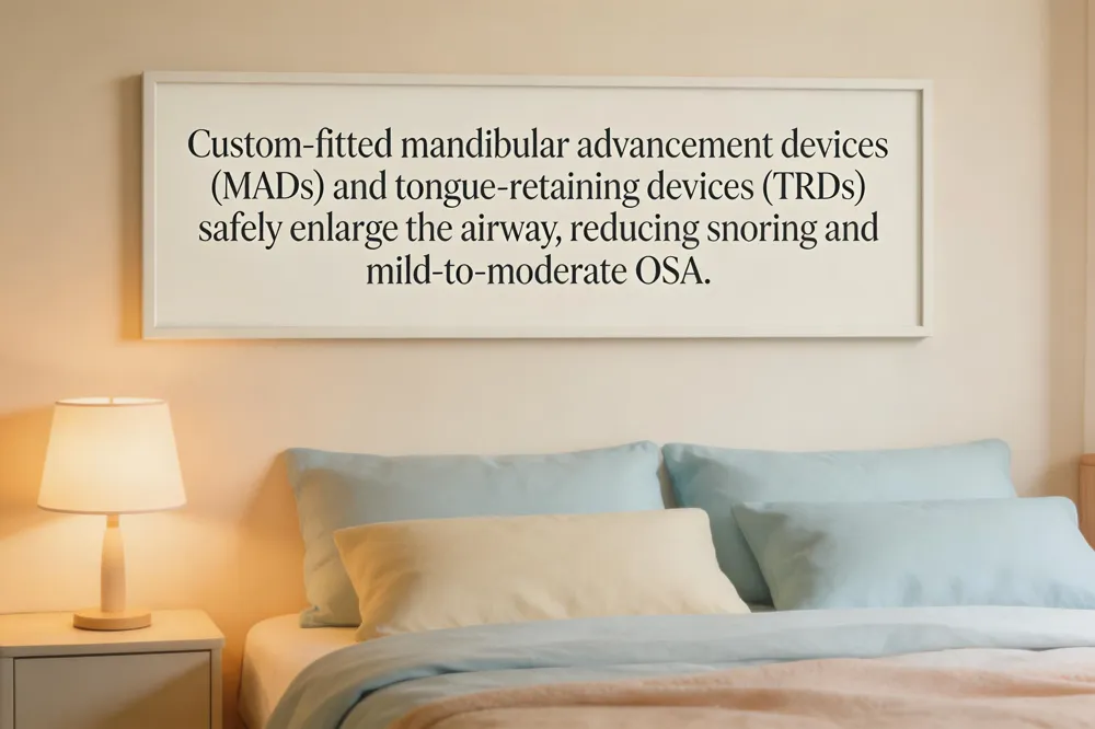 Both MADs and TRDs increase the anteroposterior airway dimension, preventing soft‑palate collapse and tongue obstruction during sleep. This non‑invasive approach restores normal airflow, reduces snoring, and improves daytime alertness.