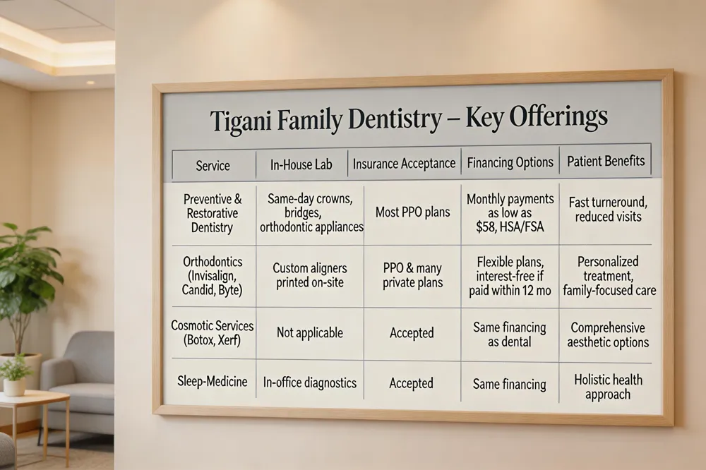 Tigani stands out as Wilmington’s top dentist because it combines comprehensive, personalized care with modern technology. The in‑house lab reduces wait times, while the family‑focused environment makes every visit comfortable and stress‑free. Accepting a wide range of PPO insurances and offering financing, the practice delivers high‑value treatment from routine check‑ups to advanced cosmetic work, earning consistently high patient satisfaction and solidifying its reputation as the best dental provider in the area.
