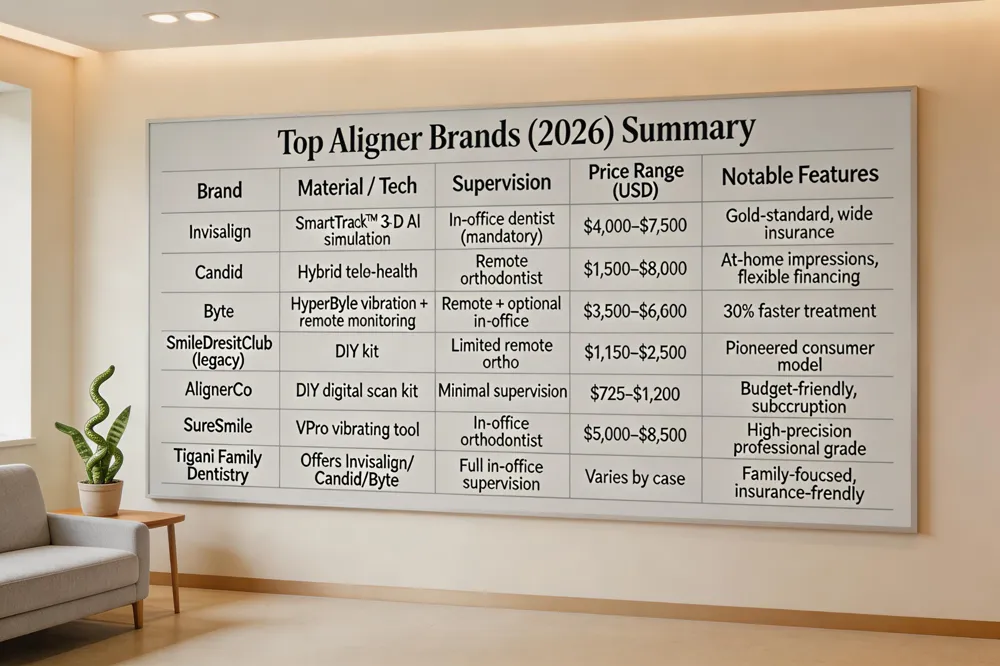 The top clear‑aligner brands in 2026 are Invisalign, Candid, Byte, and SmileDirectClub (legacy demand). Invisalign's SmartTrack material and professional oversight make it the gold standard. Candid and Byte offer affordable at‑home experiences, with Byte’s HyperByte promising faster results. AlignerCo and SureSmile provide lower‑cost or hybrid models but with limited supervision for complex cases. Tigani Family Dentistry offers Invisalign and can assess Candid or Byte suitability for personalized, family‑focused care.