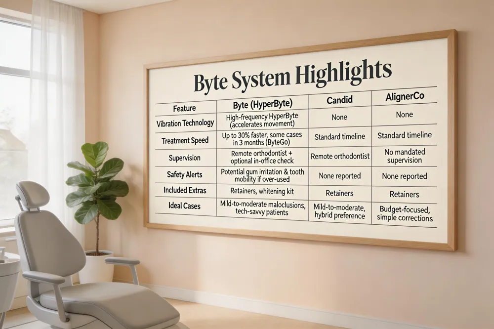 Byte’s accelerated system adds a high‑frequency vibration device (HyperByte) claimed to cut therapy time up to 30 %. Recent safety alerts warn of excessive tooth mobility and gum irritation if over‑used. Patients should have a comprehensive exam and X‑rays and keep 20‑22 hours daily wear for safe results.
