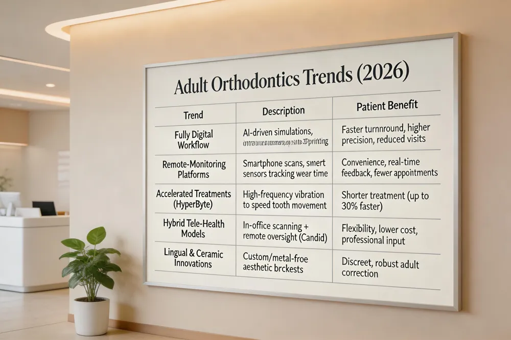 What is the new trend in orthodontics? 2026’s biggest trend is a fully digital workflow: AI‑driven treatment simulations, 3‑D intra‑oral scanning, and on‑site 3‑D printing of aligners or retainers. Remote‑monitoring platforms using smartphone scans and smart sensors track wear time and oral‑health metrics, reducing in‑office visits while maintaining safety.