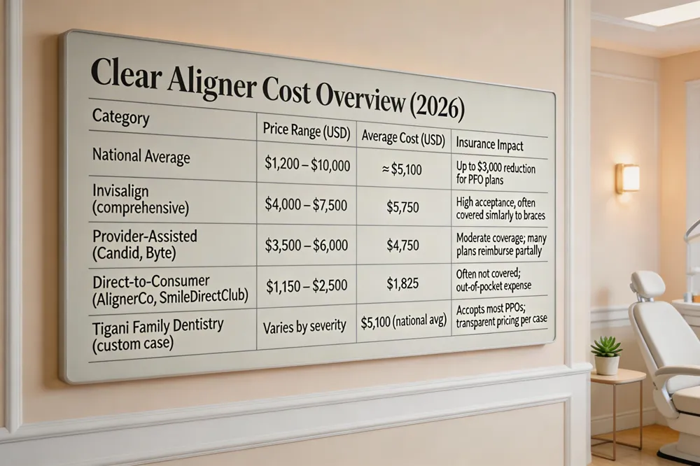| In 2026 the national price range for clear‑aligner therapy spans roughly $1,200 to $10,000, with the average cost hovering around $5,100. Invisalign, the market leader, typically falls between $4,000 and $7,500 for comprehensive cases, while provider‑assisted brands such as Candid and Byte range from $3,500 to $6,000 depending on complexity. Direct‑to‑consumer options like AlignerCo, NewSmile, and SmileDirectClub are the most budget‑friendly, starting at $1,150 and capping near $2,500 for mild to moderate crowding or spacing. Most PPO dental plans cover clear aligners similarly to metal braces, often reducing out‑of‑pocket expense by up to $3,000; many practices also offer financing with monthly payments as low as $58. At Tigani Family Dentistry in Wilmington, DE, patients receive a personalized exam, in‑house lab turnaround, and transparent pricing that reflects case severity while accepting most insurances and flexible financing. |