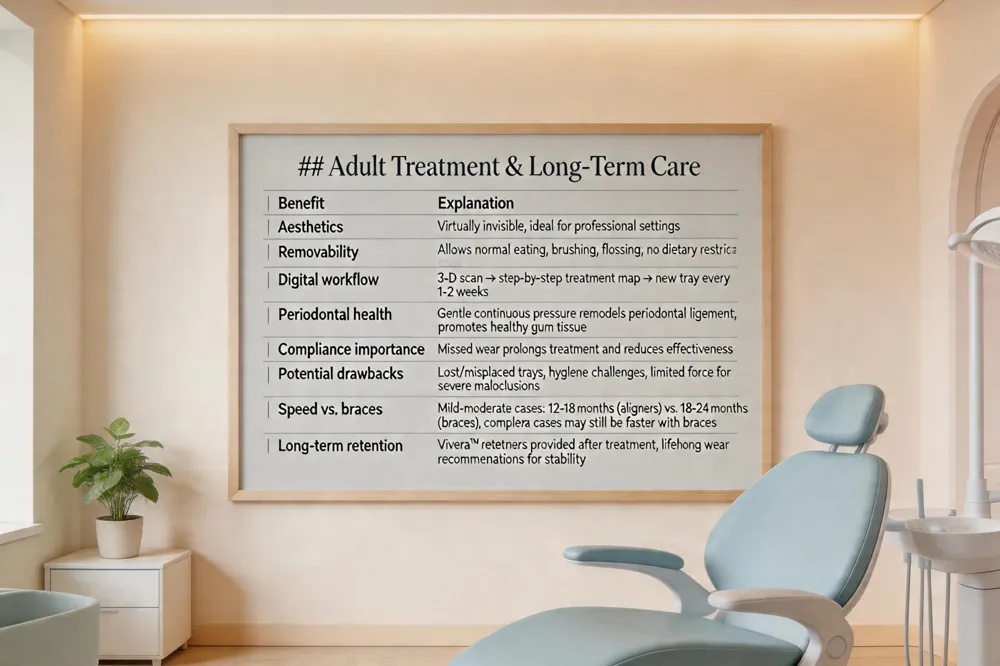 Aligners vs. braces – speed – For mild to moderate cases, aligners often finish in 12‑18 months, faster than the 18‑24 months typical for fixed braces, provided the adult wears them as prescribed. Complex cases may still be quicker with braces, as they deliver continuous force without reliance on patient wear time.