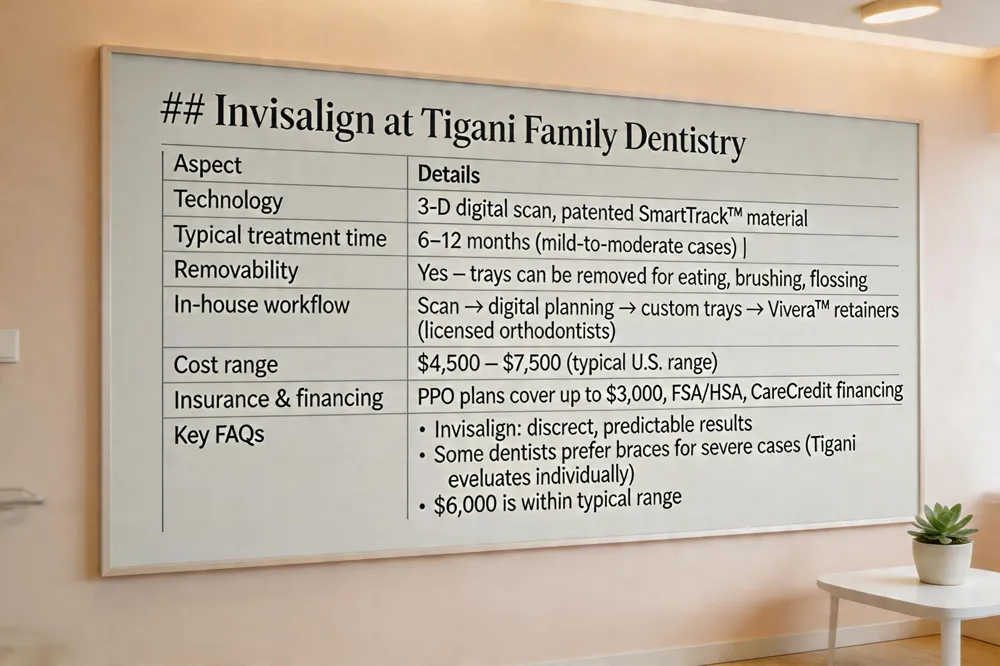 - Invisalign teeth straightening: At Tigani we provide discreet, comfortable treatment with digital planning, SmartTrack aligners, and retainers for lasting results.