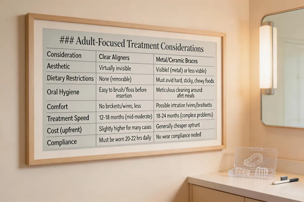 | Aesthetic and practical considerations for adults. Patients seeking a discreet, comfortable solution often choose clear aligners because they are virtually invisible, removable for meals, and easy to keep clean. Traditional metal or ceramic braces are fixed, can handle more complex movements, and may achieve results slightly faster, but they are more noticeable and require dietary restrictions. |