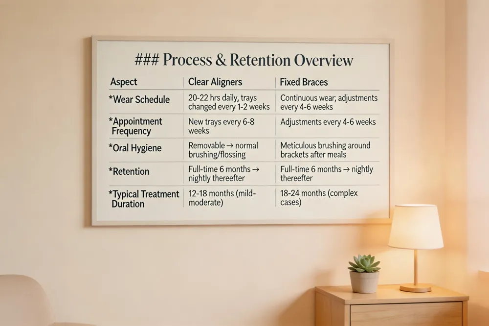 Retainers after active treatment: Once the active phase ends, both options transition to retainers after treatment—usually full‑time for six months, then nightly—to prevent relapse.