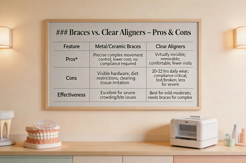 Choosing the right orthodontic appliance is more than an aesthetic decision; it impacts your daily routine, oral‑health outcomes, and long‑term stability of your smile. Braces and clear aligners differ fundamentally in visibility, wearability, and the types of malocclusions they can treat. Fixed braces (metal, ceramic, or self‑ligating) are non‑removable, visible, and excel at complex tooth movements, while removable clear aligners are virtually invisible, can be taken out for meals and brushing, and work best for mild‑to‑moderate cases when worn 20‑22 hours per day. This guide will walk you through the clinical considerations, lifestyle implications, and post‑treatment requirements for each option, helping you make an informed choice in partnership with an AAO‑qualified orthodontist.