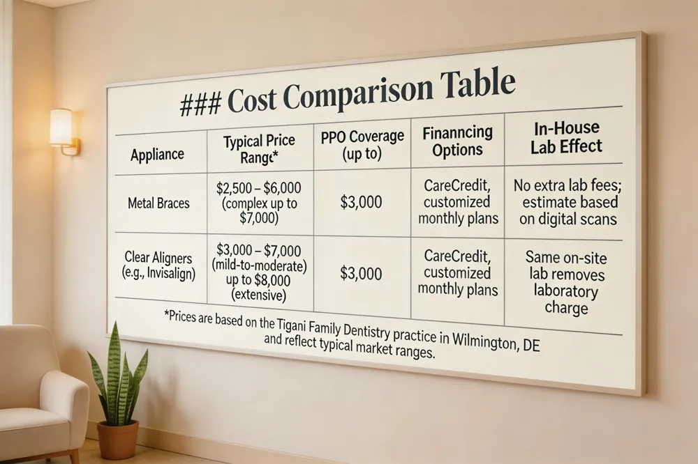Price ranges – At Tigani Family Dentistry in Wilmington, DE, traditional metal braces typically cost between $2,500 and $6,000, with more complex cases approaching $7,000. Clear‑aligner systems such as Invisalign fall in a similar ball‑park, ranging from $3,000 to $7,000 for mild‑to‑moderate movements and up to $8,000 for extensive corrections.