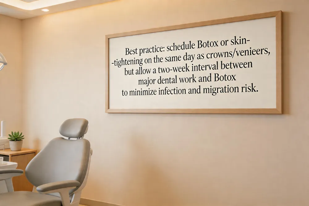 How long to wait between Botox and dentist? A two‑week interval is generally advised between a Botox injection and any invasive dental procedure (e.g., crowns, implants) to allow the injection site to heal and reduce infection or migration risk. Routine cleanings or non‑invasive exams can be scheduled the same day, provided the injection sites are distant from the mouth. After major dental work, wait about two weeks before receiving Botox to let swelling subside.