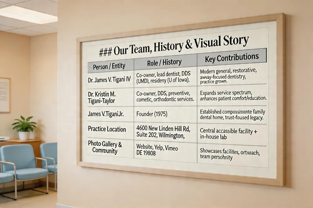 Legacy of James V. Tigani Jr. James V. Tigani Jr. founded the practice in 1975, establishing a compassionate, family‑oriented dental home for Wilmington and Pike Creek. His commitment to high‑quality, patient‑centered care set the tone for a reputation built on trust and long‑term relationships. The second‑generation team continues his legacy by maintaining a warm, welcoming environment where every patient feels like family.
