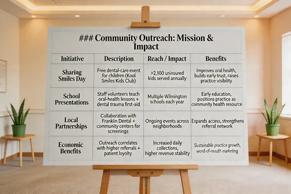 | Economic Benefits | Outreach correlates with higher referral rates and patient loyalty. | Increased daily collections, higher revenue stability. | Sustainable practice growth, word‑of‑mouth marketing. |