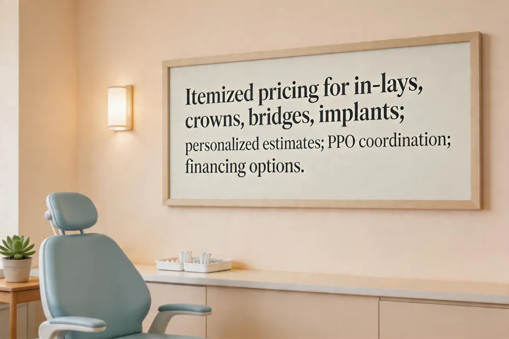 How much does restorative dental work cost? Restorative procedures are priced according to the specific treatment and case complexity, with the ranges outlined above. The practice verifies insurance benefits and offers a detailed cost breakdown before any work begins.