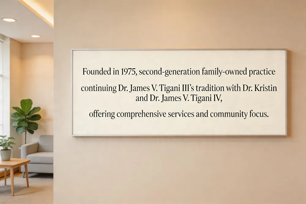 Tigani Family Dentistry was founded in 1975 by Dr. James V. Tigani III, DMD, a Georgetown graduate who earned his dental degree at Farleigh Dickinson. After his passing in 2019, his children—Dr. Kristin M. Tigani‑Taylor, D.D.S., and Dr. James V. Tigani IV, D.D.S.—took the reins, preserving a second‑generation, family‑focused approach. Dr. Kristin specializes in cosmetic, orthodontic, and airway‑focused dentistry, while Dr. James V. Tigani IV brings a residency from the University of Iowa and offers Vivos sleep‑medicine services. Together they maintain an in‑house laboratory for same‑day crowns and bridges, accept most PPO insurances, and provide aesthetic treatments like Botox and skin‑tightening.