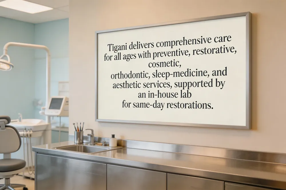 Wilmington dental clinic – Tigani Family Dentistry is a family‑owned dental clinic located in Wilmington, Delaware. It offers comprehensive dental services—including preventive care, cosmetic and restorative treatments, orthodontics, sleep‑medicine options, and aesthetic procedures such as Botox and Xerof skin tightening. The practice features an in‑house laboratory, allowing for same‑day crowns, bridges and other restorations. Most PPO insurance plans are accepted, and the team emphasizes personalized, comfortable care for patients of all ages. With a focus on a family‑oriented environment, Tigani strives to create a welcoming experience for the entire household.