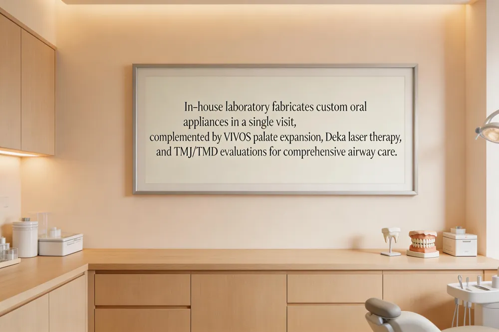 Tigani Family Dentistry in Wilmington, DE, differentiates its sleep‑medicine program through an in‑house laboratory that fabricates custom oral appliances—such as mandibular advancement devices (MADs)—in as little as one visit, ensuring a precise fit and rapid relief for snoring and mild‑to‑moderate obstructive sleep apnea (OSA). The practice also offers complementary services that enhance airway patency: VIVOS appliances that gently expand the palate, Deka Laser Therapy that tightens soft‑palate tissue, and comprehensive TMJ/TMD evaluations that address jaw tension often linked to snoring. All treatments are delivered in the family‑focused, comfortable environment that emphasizes patient education, comfort, and coordinated care with sleep physicians.