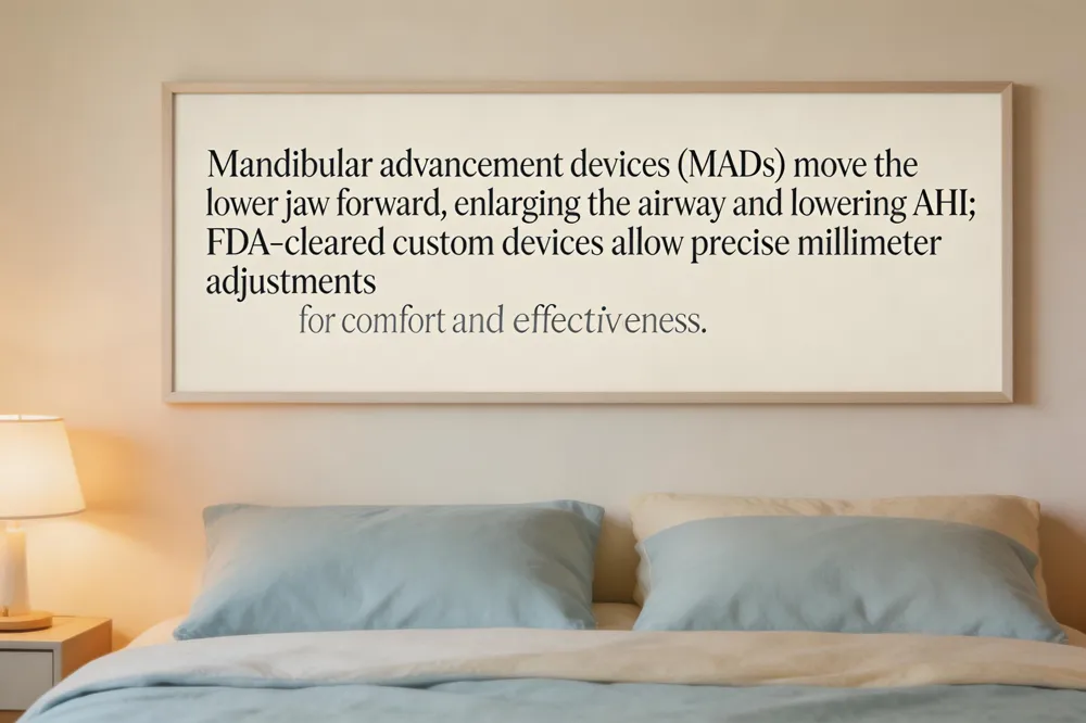 Mandibular advancement devices (MADs) treat obstructive sleep apnea by gently pulling the lower jaw forward, which also moves the tongue and enlarges the airway at the back of the throat. This forward positioning prevents soft‑tissue collapse during sleep, reducing apnea‑hypopnea events and snoring. The FDA classifies MADs as Class II medical devices and grants 510(k) clearance when safety and effectiveness are demonstrated; examples of cleared devices include SomnoDent, Drake® MAD, AirFit™ and the recently approved Hushd Pro Z‑Link, all custom‑fabricated to each patient’s anatomy. Top‑rated custom options for OSA are the SomnoDent, TAP (Thornton Adjustable Positioner), iSleep, ProSomnus EVO, and Panthera Classic, which allow precise millimeter adjustments, are built from durable acrylic or thermoplastic materials, and offer superior comfort compared with over‑the‑counter trays.