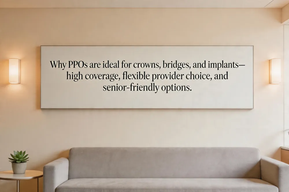 Major restorative work (crowns, bridges, implants) is best handled with a dental PPO rather than an HMO because PPOs let you stay with your preferred dentist and usually cover 80‑90 % of major procedures after a low deductible, while HMOs often require referrals and may limit specialist access. Look for a plan with an annual maximum of $1,500‑$2,000 and a $50‑$100 deductible; this keeps out‑of‑pocket costs predictable. Most PPO carriers accepted at Tigani Family Dentistry—Delta Dental, Cigna, Aetna, MetLife, Humana—offer 100 % coverage for preventive care and strong benefits for crowns, bridges, and implants, sometimes as a rider. Senior‑friendly PPOs (Delta Dental Senior, Cigna Medicare Advantage, Guardian Senior) provide higher maximums, no waiting periods for preventive services, and lower copays, which fits fixed‑income budgets. Cost‑effective options include basic PPOs with $1,000 maximums and 50‑80 % coverage for basic work, while still covering preventive services at 100 %. In‑house lab at Tigani speeds up restorations and reduces overall expense. For wisdom‑tooth extraction, any PPO with major‑procedure coverage will pay 60‑80 % after deductible, making the treatment affordable.
