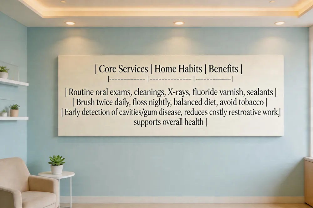 Preventive dental care is a comprehensive approach that combines routine professional services with daily home habits to keep the mouth healthy and stop disease before it starts. Routine oral exams, professional cleanings, diagnostic X‑rays, fluoride treatments, and dental sealants are core services, while brushing twice daily with fluoride toothpaste, flossing, a balanced diet, and avoiding tobacco round at‑home essentials. These measures allow early detection of cavities, gum disease, and oral cancer, often avoiding more extensive and costly restorative work.