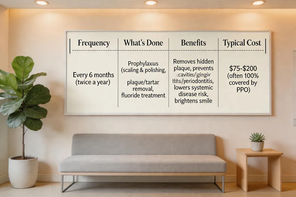 Every six‑month cleaning removes hidden plaque, prevents decay, and allows early detection of oral cancer or other problems. It brightens the smile, freshens breath, and supports overall health by reducing bacterial load linked to systemic disease.