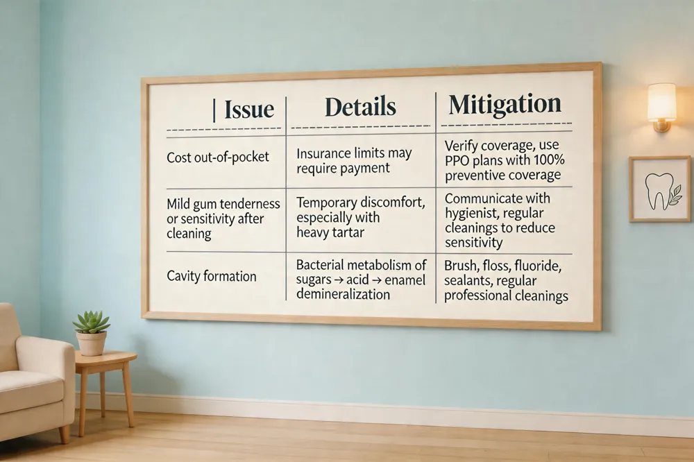 Professional cleanings are generally safe, but they can involve out‑of‑pocket costs when insurance limits are reached. Some patients experience mild gum tenderness, temporary tooth sensitivity, or slight bleeding after scaling, especially if they have gum inflammation. Deep periodontal cleanings may cause brief discomfort, and scheduling regular visits can be inconvenient for busy families. Despite these minor issues, the long‑term oral‑health benefits outweigh the short‑term drawbacks.