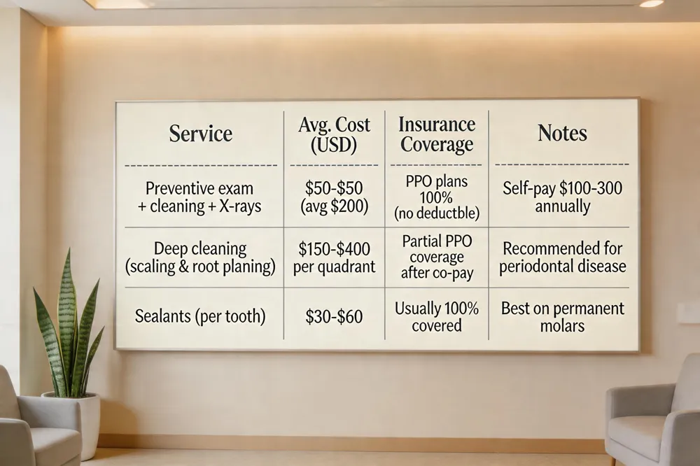 At Tigani Family Dentistry a routine cleaning ranges from $75‑$200. Most PPO plans cover it at 100 % after any co‑pay, often leaving no out‑of‑pocket cost. Deep cleanings cost more, but regular prophylaxis helps avoid those higher expenses.