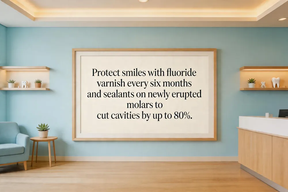 Fluoride varnish applications are a safe, painless way to strengthen enamel and reduce new cavities by about one‑third in primary teeth. The CDC and AAPD recommend varnish every six months, especially for high‑risk children. Dental sealants on the chewing surfaces of permanent molars create a thin barrier that blocks plaque and food debris, preventing up to 80% of cavities in those deep grooves. Sealants are most effective when placed soon after the first permanent molars erupt, typically around age six. Routine dental examinations every six months allow the dentist to assess oral health, detect early decay, apply fluoride varnish or sealants, and provide professional cleanings that remove tartar beyond the reach of home care.