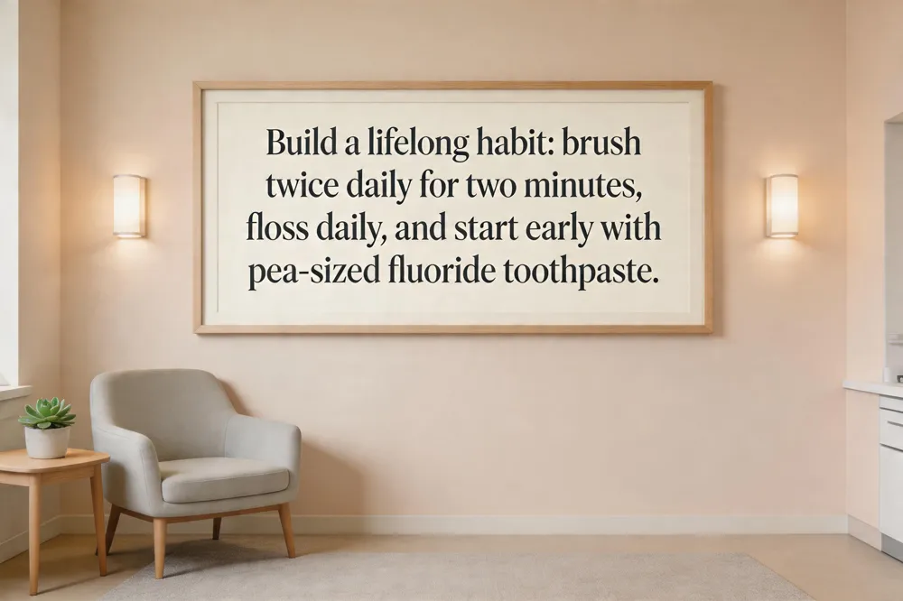 Preventing cavities starts early and relies on a handful of proven habits. Clean an infant’s gums with a soft cloth before teeth appear, then brush twice daily with a soft‑bristled brush and a pea‑size amount of fluoride toothpaste once the first tooth erupts. Supervise brushing until children can reliably spit out toothpaste and brush for two minutes. Add daily flossing as soon as two teeth touch, limit sugary snacks and drinks, and encourage water—especially fluoridated tap water—as the beverage. Professional fluoride varnish and dental sealants applied by a dentist can cut cavity risk by up to one‑third and 80 % respectively. Six‑month check‑ups allow early detection of problems and timely preventive care.