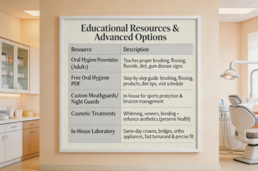 We provide a free Oral Hygiene PDF that outlines step‑by‑step brushing and flossing, product selection, diet tips, and the need for routine dental visits. The guide can be downloaded here: Oral Hygiene PDF.