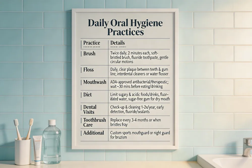 | Maintaining a healthy smile starts with a solid daily routine. 5 Ways to take care of your teeth: (1) Brush twice a day for two minutes with a fluoride toothpaste, using a soft‑bristled brush and gentle circular motions; (2) Floss daily to clear plaque from between teeth and the gum line; (3) Limit sugary and acidic foods and drinks while drinking fluoridated water; (4) Schedule regular dental check‑ups and cleanings at least once a year for early detection and professional fluoride or sealant treatments; (5) Use an antibacterial mouthwash and consider a custom mouthguard for sports. |