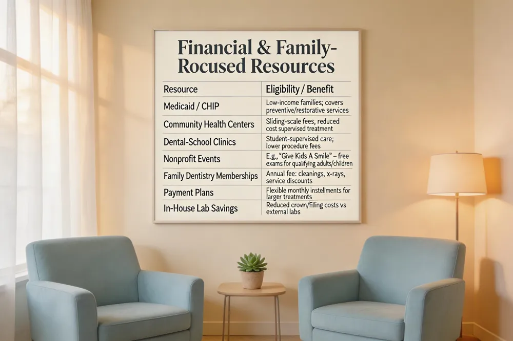 Family‑focused offices such as Tigani Family Dentistry add flexible payment plans, membership bundles for cleanings, and a lab that lowers crown and filling costs. Compared with specialty or solo practices, family offices spread overhead across all ages, resulting in lower per‑procedure fees.