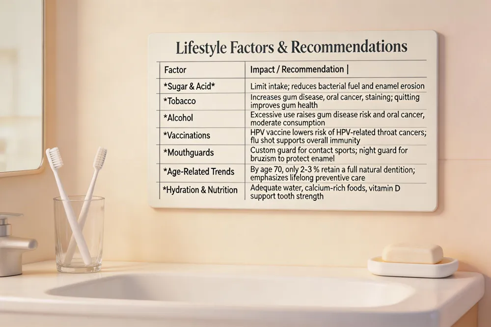 Sugar & acid moderation – Limit sugary drinks and acidic foods; they feed decay‑causing bacteria and erode enamel.
