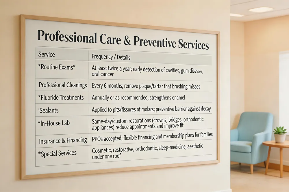 | Regular dental exams and cleanings at least twice a year allow early detection of cavities, gum disease, and oral cancer, while fluoride treatments and sealants provide an extra barrier against decay. An in‑house laboratory speeds up custom restorations, reducing appointment times and improving fit. Most PPO insurances are accepted, and flexible financing options make comprehensive care accessible for families. |