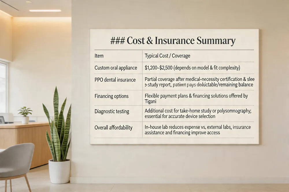 Diagnostic testing, such as a take‑home sleep study or polysomnography, adds to the total expense. However, accurate diagnosis ensures appropriate appliance selection and can reduce the need for future adjustments, ultimately saving money. Tigani assists patients in coordinating diagnostics and insurance paperwork to maximize reimbursement and streamline care.