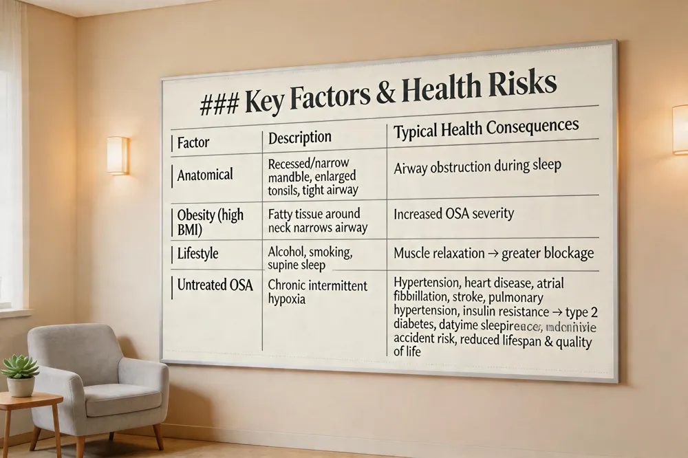 Obstructive sleep apnea (OSA) is characterized by repeated collapse of the upper airway during sleep, which interrupts breathing and lowers blood‑oxygen levels. Anatomical contributors include a recessed or narrow mandible, enlarged tonsils, and a naturally tight airway, while excess body‑mass index adds fatty tissue around the neck that narrows the passage. Lifestyle factors such as alcohol consumption, smoking, and supine sleeping further relax throat muscles and exacerbate airway blockage. Untreated OSA carries serious health risks: chronic intermittent hypoxia drives hypertension, increases the likelihood of heart disease, atrial fibrillation, stroke, and pulmonary hypertension, and promotes insulin resistance leading to type 2 diabetes. Sleep fragmentation produces excessive daytime sleepiness, impaired cognition, mood disturbances, and a higher incidence of motor‑vehicle accidents. Over time, these cardiovascular, metabolic, and neurocognitive impacts can shorten lifespan and markedly reduce quality of life.