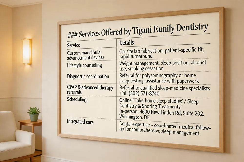 Tigai Family Dentistry in Wilmington, DE treats obstructive sleep apnea primarily with custom‑fabricated mandibular advancement devices (mandibular advancement devices (MADs)). Using an on‑site laboratory, the practice creates precise, patient‑specific oral appliances that gently reposition the lower jaw to keep the airway open, delivering faster turnaround and easy adjustments. In addition to appliance therapy, the team provides lifestyle counseling that addresses weight management, sleep position, alcohol use, and other factors that can worsen apnea. When a patient’s condition warrants more extensive testing, Tigani promptly refers them to a qualified sleep‑medicine specialist for diagnostic polysomnography or home sleep testing and possible CPAP or advanced therapies. Scheduling a sleep‑apnea evaluation is simple: patients can call (302) 571‑8740, use the online booking portal selecting “Take‑home sleep studies” or “Sleep Dentistry & Snoring Treatments,” or visit the office at 4600 New Linden Rd, Suite 202, Wilmington, DE during regular office hours. The comprehensive, family‑focused approach blends dental expertise with coordinated medical care to deliver effective, comfortable,‑management options.