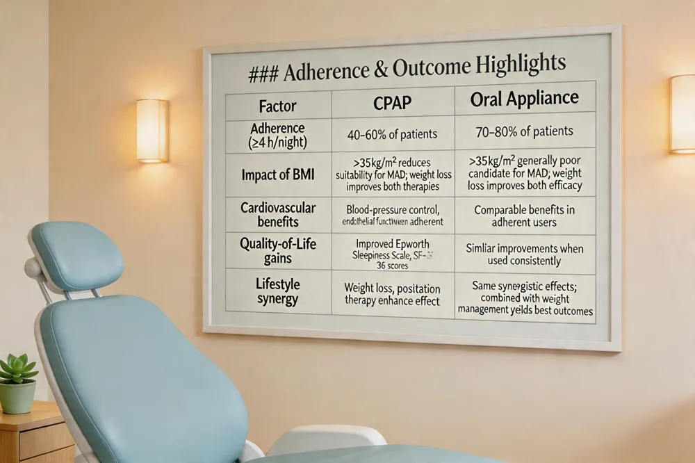 Adherence is a decisive factor in real‑world effectiveness. While CPAP reduces the apnea‑hypopnea index (AHI) by 80‑90 % when used, only about 40‑60 % of patients meet the recommended 4‑hour/night threshold; oral appliances achieve higher nightly use, with adherence rates of 70‑80 % because they are quieter, portable, and mask‑free. BMI strongly influences success: patients with a BMI >35 kg/m² are generally poor candidates for mandibular advancement splints, whereas weight loss improves both CPAP and appliance efficacy and can lower AHI by roughly 7 % per 7‑pound reduction. Patient preference and shared decision‑making improve compliance—studies show individuals who receive their chosen therapy (CPAP or oral appliance) are more likely to use it consistently. Despite CPAP’s superior AHI reduction, long‑term data reveal comparable cardiovascular benefits (blood‑pressure control, endothelial function) and quality‑of‑life gains (Epworth Sleepiness Scale, SF‑36) for adherent oral‑appliance users, especially when combined with lifestyle measures such as weight management and positional therapy.