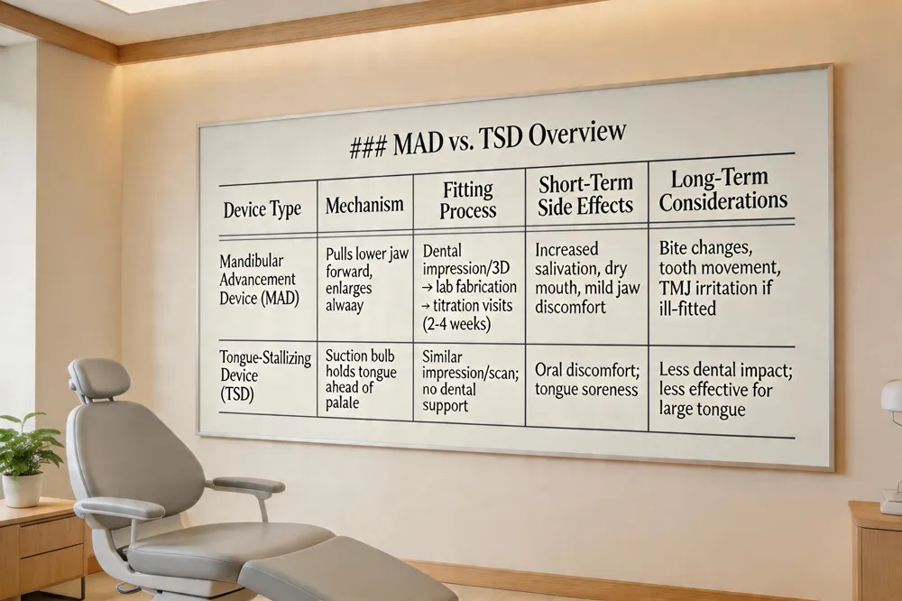 Mandibular advancement devices (MADs) and tongue‑stabilizing devices (TSDs) are the two principal oral appliances for obstructive sleep apnea. MADs are custom‑made mouthpieces that pull the lower jaw forward, enlarging the airway; TSDs use a suction bulb to hold the tongue ahead of the palate when dental support is limited. The fitting process begins with a dental impression or 3‑D scan, followed by laboratory fabrication of a precise, retainer‑like device. After delivery, patients wear the appliance for two to four weeks, gradually increasing nightly use while the dentist makes small titrations to achieve optimal mandibular protrusion and comfort. Short‑term side effects may include increased salivation, dry mouth, or mild jaw discomfort; long‑term issues can involve bite changes, tooth movement, or TMJ irritation if the device is ill‑fitted.