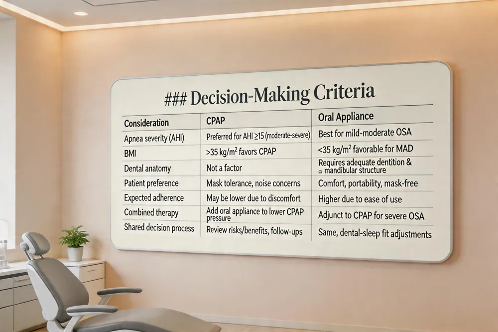 Family‑focused, personalized care A shared‑decision‑making model involves the patient (and family) reviewing risks, benefits, and lifestyle impacts. Preference‑diagnosis tools increase adherence, and regular dental‑sleep follow‑ups ensure optimal fit, monitor oral health, and adjust therapy as needed.