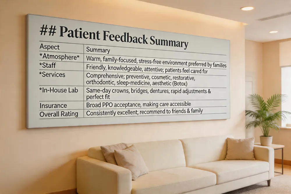 Tigani Family Dentistry reviews consistently emphasize a warm, family‑focused atmosphere and personalized care from Dr. Kristin Tigani and Dr. James Tigani. Reviewers note the staff’s friendliness, knowledge, and attentiveness, describing the office as stress‑free and comfortable. The practice’s comprehensive suite—preventive, cosmetic, restorative, orthodontic, sleep‑medicine solutions, and aesthetic services such as Botox—receives high praise for convenience and quality. Patients frequently highlight the in‑house laboratory, which enables same‑day crowns, bridges, and dentures, reducing wait times and enhancing treatment efficiency. Most reviewers rate the practice as excellent and recommend it to friends and family.