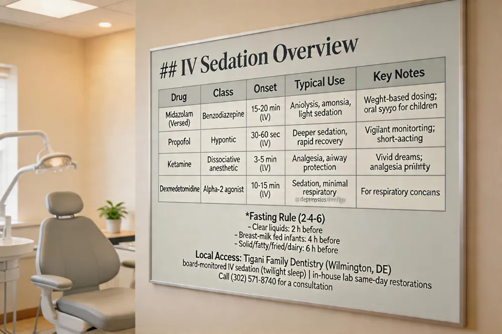 Local Access: Tigani Family Dentistry (Wilmington, DE) offers board‑monitored IV sedation (twilight sleep) with an in‑house lab for same‑day restorations. Call (302) 571‑8740 for a consultation.