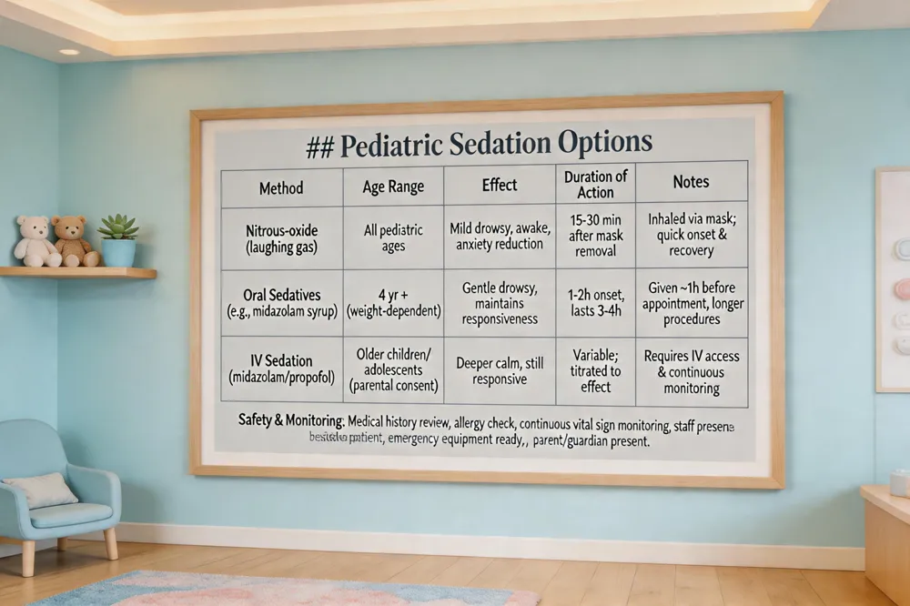 | Oral Sedatives (e.g., midazolam syrup) | 4 yr + (depending on weight) | Gentle drowsy state, maintains responsiveness | 1‑2 h onset, effect lasts 3‑4 h | Given ~1 h before appointment; useful for longer procedures |