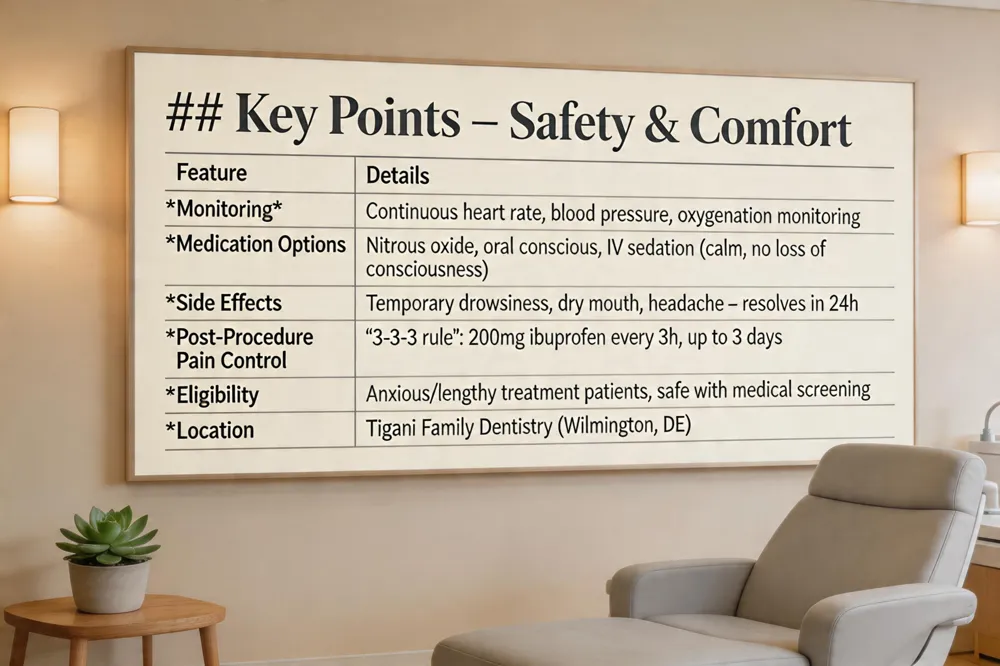 Sleep dentistry ( sedation dentistry ) is generally safe when performed by a qualified dental team that monitors vital signs throughout the procedure. A thorough medical history and screening identify any conditions that could increase risk, and the dentist adjusts medication doses in real time, ensuring normal breathing and consciousness. Patients remain aware—alert and able to respond—while feeling deeply relaxed; nitrous oxide provides a mild drowsy state, oral conscious sedation keeps you awake but drowsy, and IV sedation offers deeper calm without loss of consciousness. Most side effects are mild and short‑lived, such as temporary drowsiness, a dry mouth, headache, or a feeling of disorientation that resolves within 24 hours. Continuous monitoring of heart rate, blood pressure, and oxygenation helps catch any unexpected reactions early. For post‑procedure pain control, many clinicians recommend the "3‑3‑3 rule": take 200 mg ibuprofen every 3 hours, up to 3 days, to manage inflammation and discomfort. When offered at family‑focused practices like Tigani Family Dentistry, sleep dentistry provides a comfortable, low‑risk option for anxious patients or those requiring lengthy treatments, allowing them to receive care they might otherwise avoid.