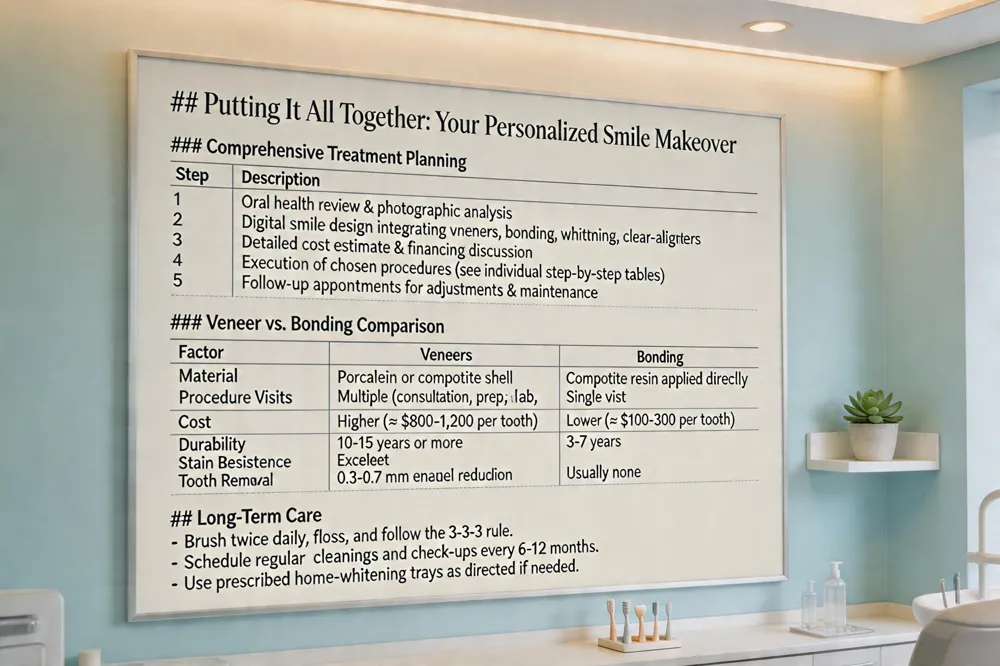 A successful smile makeover starts with comprehensive treatment planning. At Tigani Family Dentistry the dentist reviews oral health, photographs the smile, and creates a digital design that integrates veneers, bonding, professional whitening, and, if needed, clear‑aligner orthodontics.