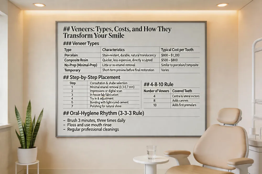 Daily oral‑hygiene rhythm (3‑3‑3 rule) – Brush for 3 minutes, three times daily, plus floss and regular cleanings to protect both veneers and natural teeth.