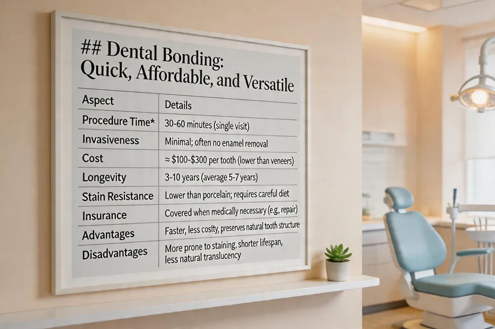 Dental bonding vs. veneers – Bonding uses tooth‑colored composite resin applied directly in a single 30‑60‑minute visit, ideal for small chips, gaps, or mild stains, costing less but lasting 3‑7 years and more prone to staining. Porcelain veneers require enamel reduction, lab‑fabricated shells, and multiple visits; they offer natural translucency, stain resistance, and durability of 10‑15 years or more for more extensive cosmetic corrections.
