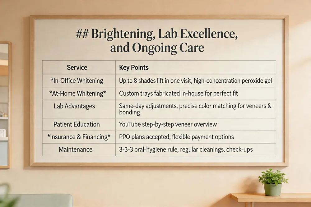 Tigani accepts most PPO insurances and offers flexible financing, making cosmetic care affordable for families. Regular oral‑hygiene habits—brushing twice daily, flossing, and the 3‑3‑3 rule (brush, floss, rinse for three minutes each, three times a day)—help preserve both whitening results and restorations. Schedule a consultation today to experience a bright, lasting smile with personalized, family‑focused care.
