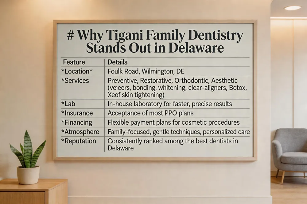 | Tigani Family Dentistry is consistently ranked among the best dentists in Delaware for its reputation as a top, dental practice that blends preventive, restorative, orthodontic, and aesthetic services. Conveniently located on Foulk Road in Wilmington, the family‑owned office serves patients of all ages with a comfortable, personalized approach that emphasizes gentle techniques and a family‑focused atmosphere. The clinic’s full‑service cosmetic and aesthetic offerings include porcelain veneers, composite bonding, professional teeth whitening, clear‑aligner therapy, and facial rejuvenation such as Botox and Xeof skin tightening—all crafted in an in‑house laboratory for faster, precise results and the most patients most nursingMore Comprehensive acceptance of most PPO insurance plans and flexible financing make advanced smile‑enhancement options accessible. Whether you are searching for the best dentist in Wilmington, DE, or a trusted cosmetic dentistry provider, Tigani Family Dentistry delivers comprehensive, high‑quality care that stands out as the clear choice for Delaware families. |