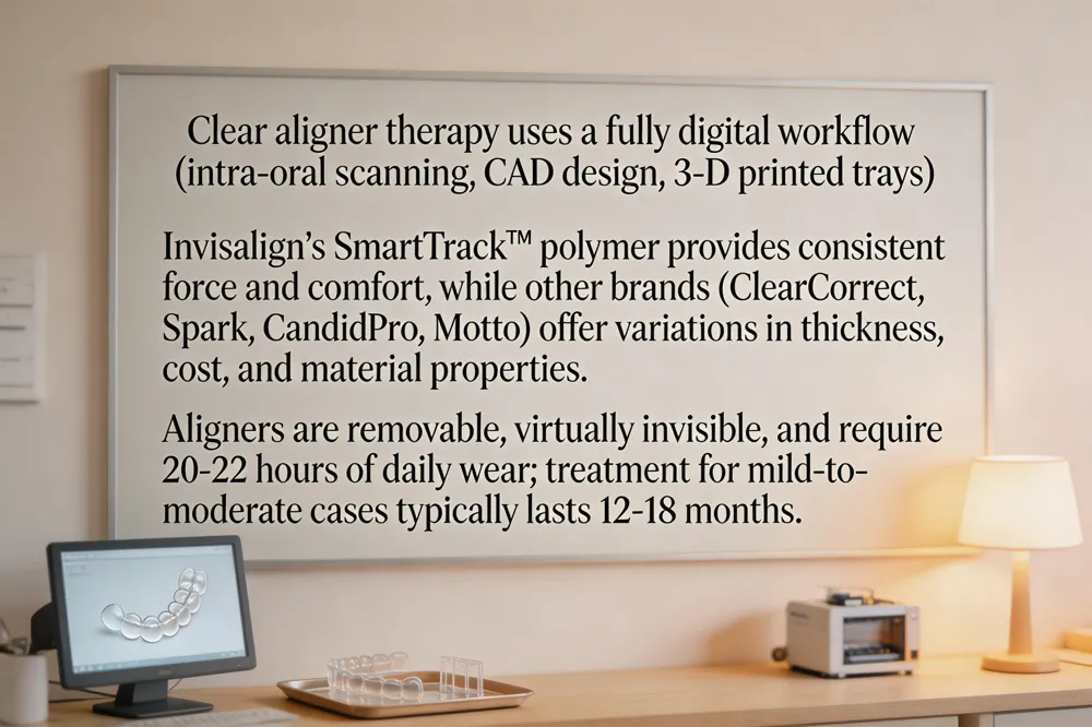 Clear aligner therapy relies on a fully digital workflow: an intra‑oral scanner captures a 3‑D model, computer‑aided design plans incremental tooth movements, and the final series of trays is fabricated from medical‑grade, BPA‑free thermoplastic. The most widely used material is Invisalign’s SmartTrack™ polymer, which delivers a softer, more consistent force and greater comfort than older single‑layer plastics. Other notable brands include ClearCorrect (thin trays, slightly lower cost), Spark (TruGEN™ material with high stain resistance), CandidPro (doctor‑directed with remote monitoring), and Motto (affordable, in‑house lab option). All of these are clear aligners, but Invisalign stands out for its proprietary SmartForce attachments and extensive digital planning that can handle complex rotations and mild to moderate extractions.