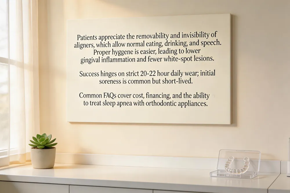 Clear aligner therapy fits easily into daily life because the trays are removable and invisible. Patients are instructed to wear each set for 20‑22 hours per day, typically changing to a new aligner every 10‑15 days; this schedule allows normal eating, drinking (water only while the aligner is in), and unrestricted speech, making the treatment virtually unnoticeable in social and professional settings. Oral hygiene benefits are substantial—because aligners are removed for brushing and flossing, plaque buildup is reduced, gingival inflammation drops, and the incidence of white‑spot lesions is lower than with fixed braces. Common concerns include the need for strict compliance, mild initial soreness, and the fear of losing trays; clinicians mitigate these by providing clear wear‑time instructions, using comfortable SmartTrack™ or TruGEN™ materials, and offering attachments or auxiliaries when complex movements are required.